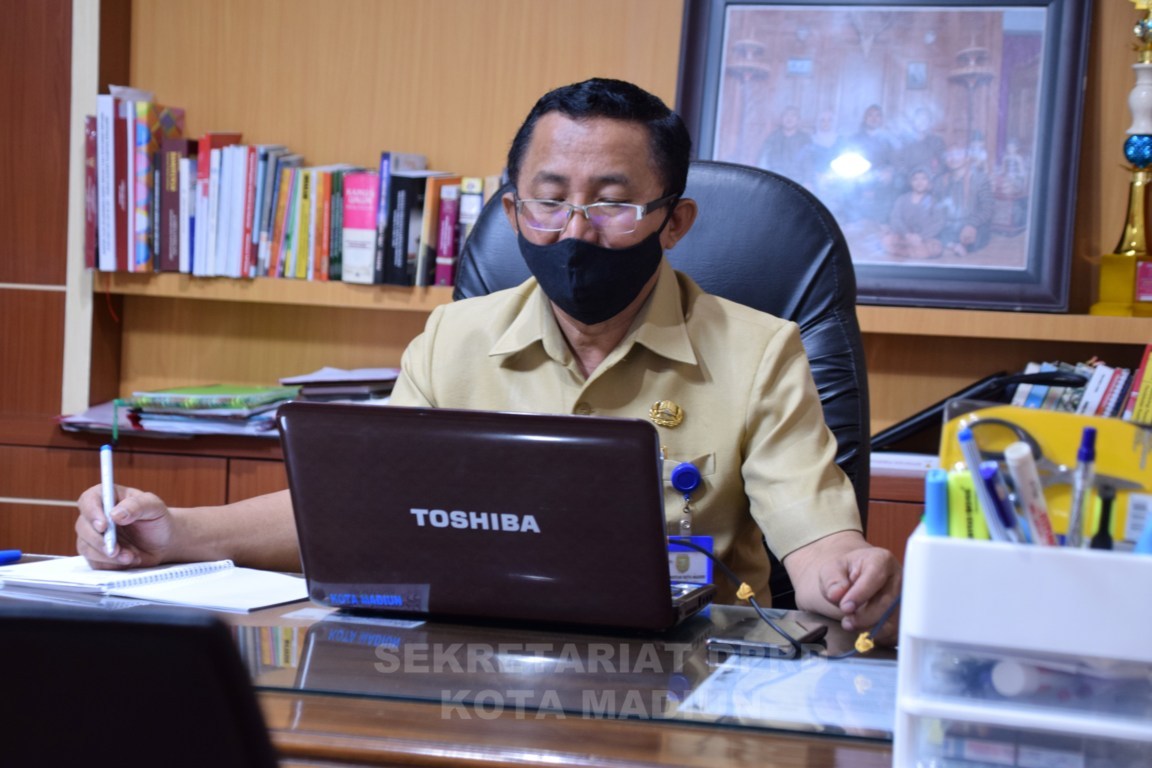Madiun- Senin, 8 Februari 2021 Misdi (Sekretaris DPRD Kota Madiun) mengikuti rapat dinas dengan Staf Ahli, para Asisten dan seluruh jajaran Kepala Organisasi Perangkat Daerah (OPD) secara virtual di ruang kerja Sekretaris DRPD. Rapat tersebut dipimpin langsung oleh Maidi (Walikota Madiun).