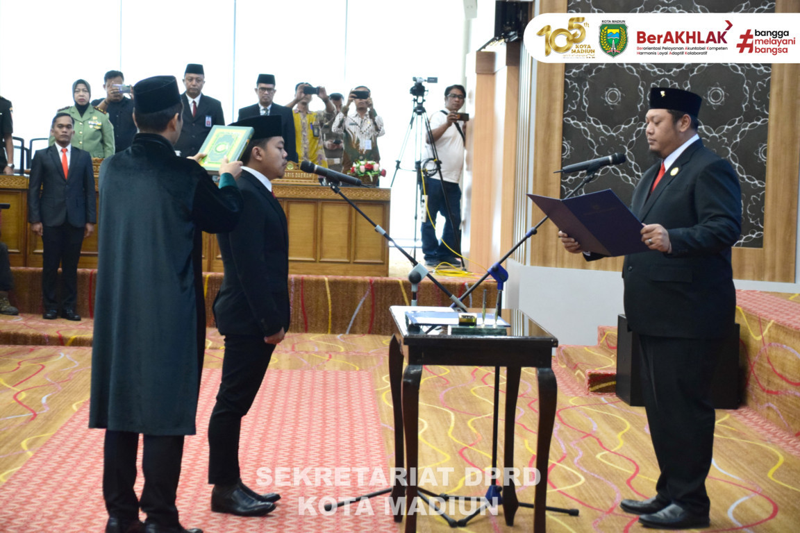 Andi Raya Ketua DPRD Kota Madiun sekaligus pimpinan rapat menyampaikan bahwa anggota DPRD Pengganti Antarwaktu sebelum memangku jabatannya, mengucapkan sumpah/janji yang dipandu oleh Pimpinan DPRD dalam rapat paripurna mengacu pada pasal 123 ayat (1) peraturan DPRD Kota Madiun nomor 01 Tahun 2019 tentang perubahan atas peraturan DPRD Nomor 01 Tahun 2018 tentang tata tertib DPRD.