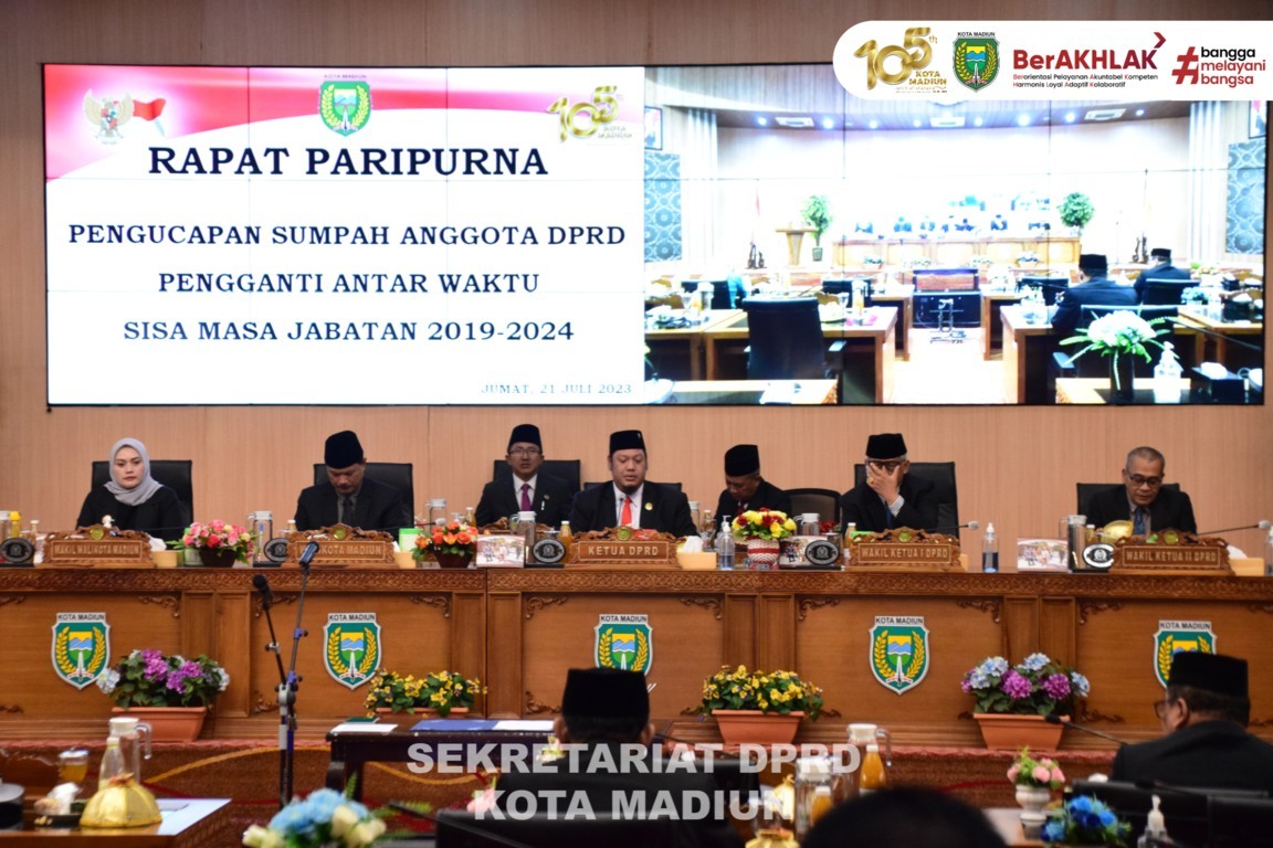 Madiun – Dewan Perwakilan Rakyat Daerah Kota Madiun menggelar Rapat Paripurna dengan agenda Pengucapan Sumpah Anggota DPRD Kota Madiun Pengganti Antarwaktu hari ini, Jum’at (21/7) di Gedung Paripurna DPRD Kota Madiun.