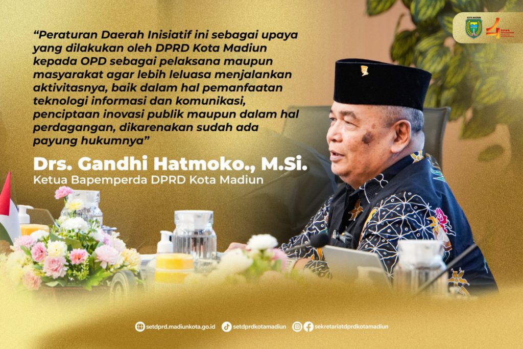 Ketua Bapemperda, Drs. Gandhi Hatmoko, M.Si., menyampaikan Peraturan Daerah Inisiatif ini sebagai upaya yang dilakukan oleh DPRD Kota Madiun kepada OPD sebagai pelaksana maupun masyarakat agar lebih leluasa menjalankan aktivitasnya, baik dalam hal pemanfaatan teknologi informasi dan komunikasi, penciptaan inovasi publik maupun dalam hal perdagangan, dikarenakan sudah ada payung hukumnya.Lebih lanjut, Drs. Gandhi Hatmoko M.Si., menambahkan tujuan utama dari dibentuknya Peraturan Daerah adalah untuk memberdayakan masyarakat dan mewujudkan kemandirian daerah. (PPIDSetwan)